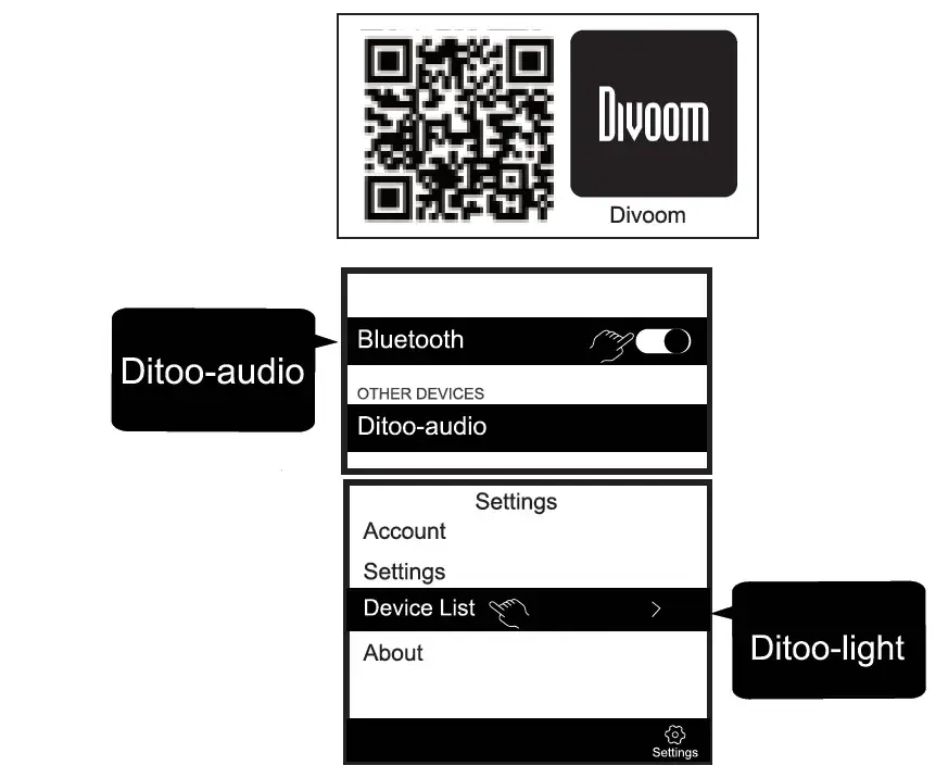블루투스 설정에서 'Ditoo-audio'를 검색하여 연결한 후, Divoom 시작 앱에서 'Ditoo-light'를 검색하여 연결합니다.